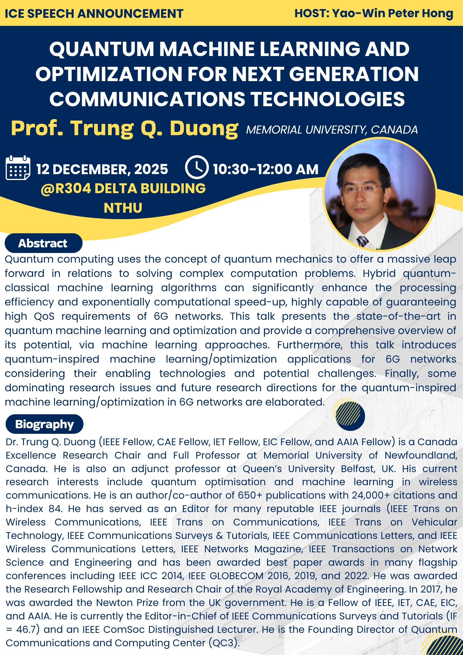 2025/12/12 (Fri.) 10:30 Prof. Trung Q. Duong, Memorial University, Canada - Quantum Machine Learning and Optimization for Next Generation Communications Technologies